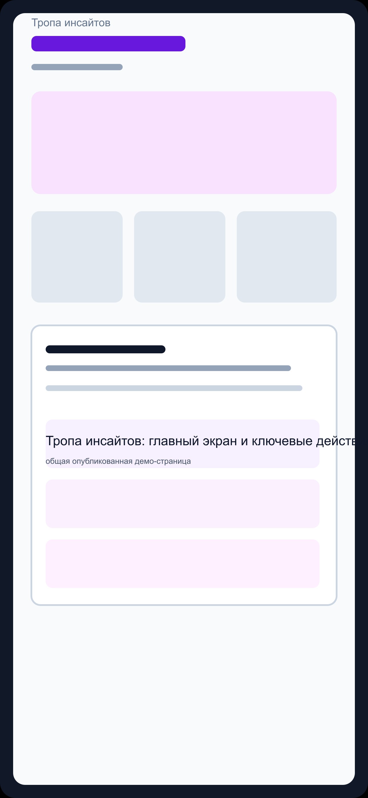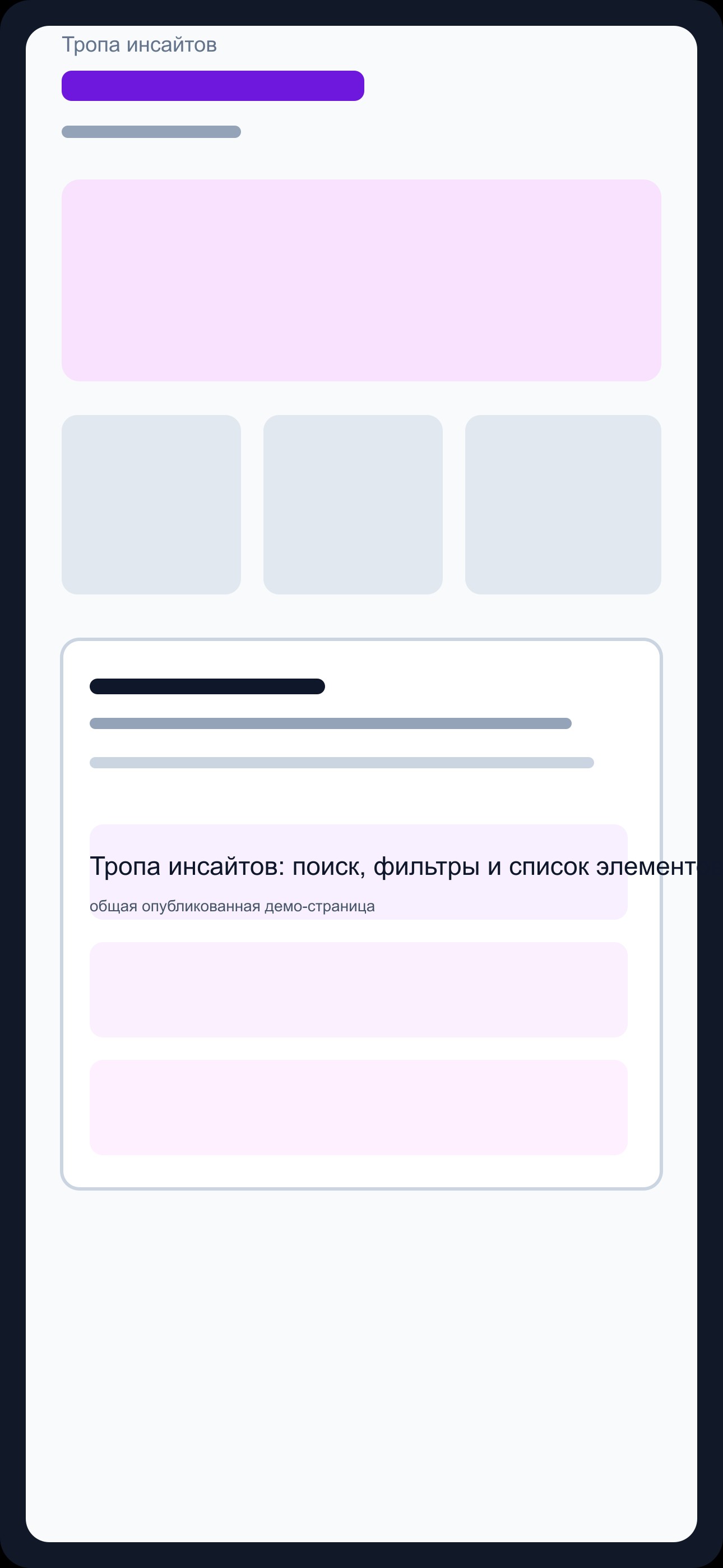 Тропа инсайтов показывает учебный интерфейс для категории «Аналитика» и подходит для каталога, поиска, карточек, фильтров и авторизации.