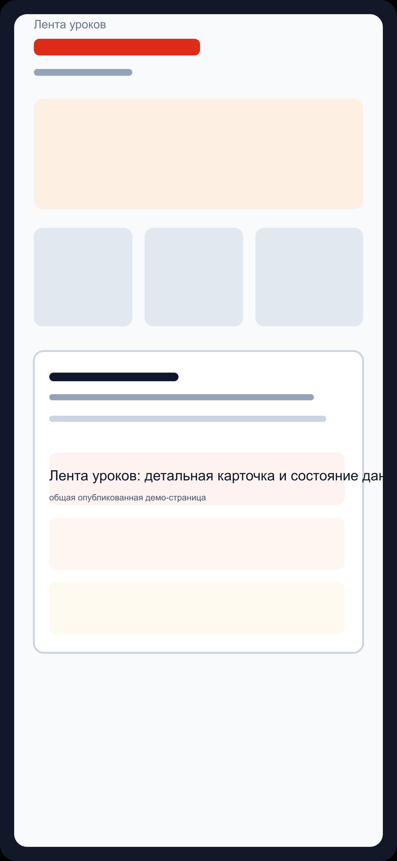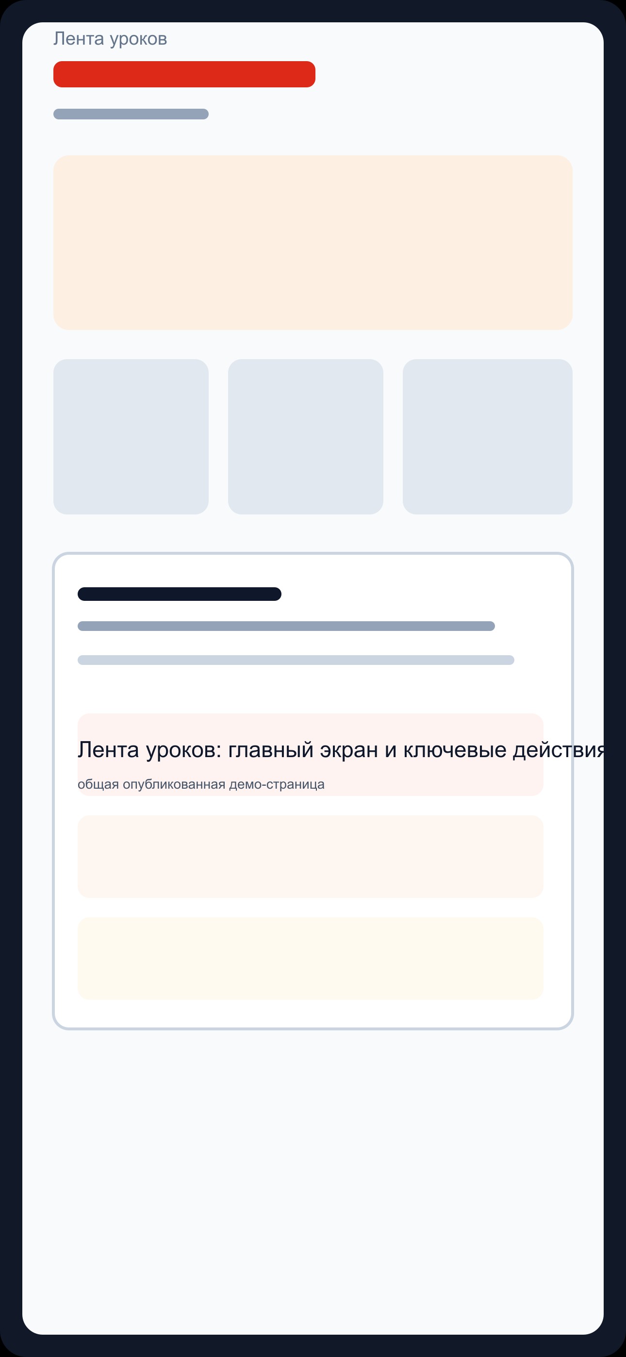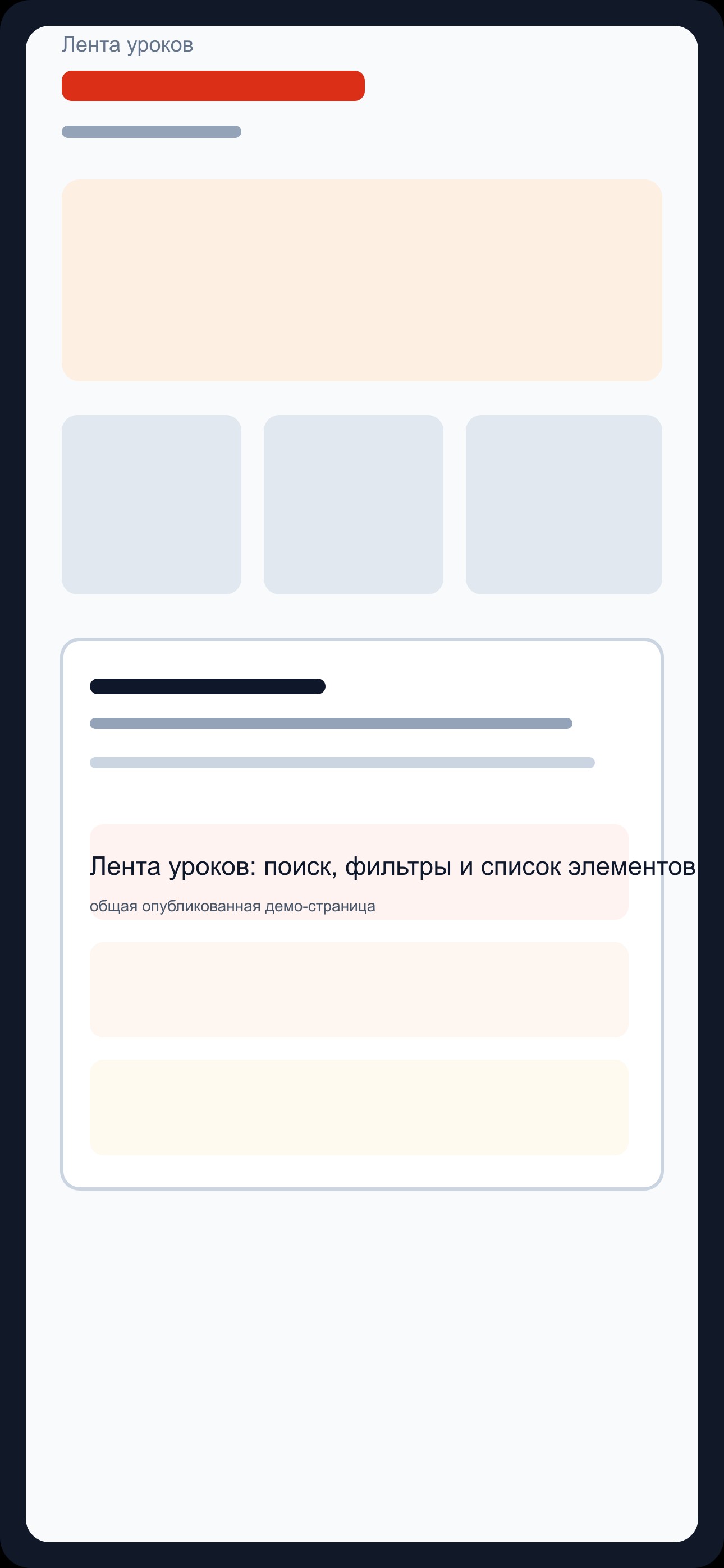 Лента уроков показывает учебный интерфейс для категории «Обучение» и подходит для каталога, поиска, карточек, фильтров и авторизации.